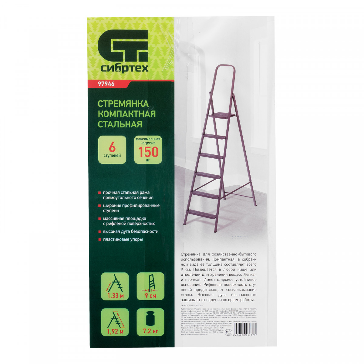 Стремянка компактная стальная Сибртех 97946 с 6 ступенями служит для проведения работ на высоте, превышающей человеческий рост. Стальные профилированные рама и ступени рассчитаны на нагрузку до 150 кг. Площадка находится на высоте 133 см от опорной поверхности, рабочая высота стремянки составляет 333 см (при среднем росте пользователя 170 см). Использовать стремянку можно дома, на даче или в гараже, а также во время строительства и ремонта.
