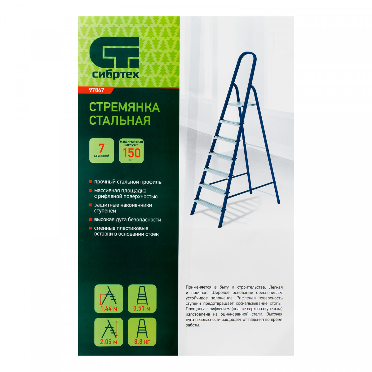Стремянка стальная Сибртех 97847 с 7 ступенями облегчает выполнение ремонтных, отделочных, а также различных бытовых работ на высоте, превышающей человеческий рост. Площадка находится на высоте 142,5 см от опорной поверхности, рабочая высота стремянки составляет 342,5 см (при среднем росте пользователя 170 см). Высокая дуга безопасности обеспечивает удобную эксплуатацию. Стремянка пригодится дома и на даче.