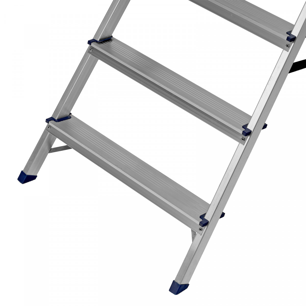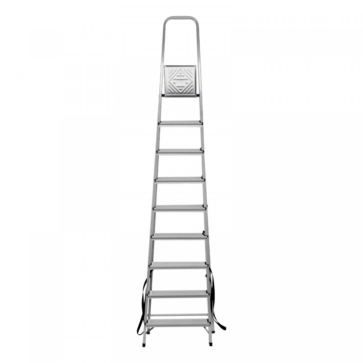 - Надежность — рама из прямоугольного алюминиевого профиля выдерживает нагрузку до 150 кг, широкие ступени закреплены заклепками, страховочные стяжки повышают прочность конструкции.