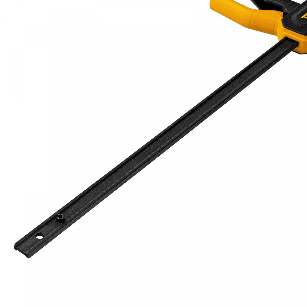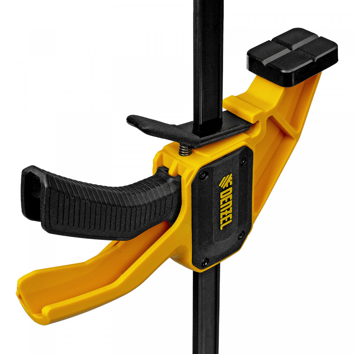 - Комфортное использование — струбцина весит всего 710 г, обрезиненная кнопка фиксации обеспечивает удобный захват.
