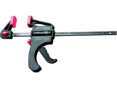 Струбцина изготовлена из инструментальной стали. Направляющая стальная. Рабочие губки снабжены накладками для предотвращения повреждений обрабатываемых предметов. Опорная губка перемещается и фиксируется по всей длине направляющей при помощи ручки, а также может переставляться на другой конец направляющей, что позволяет использовать струбцину «на разжим».
