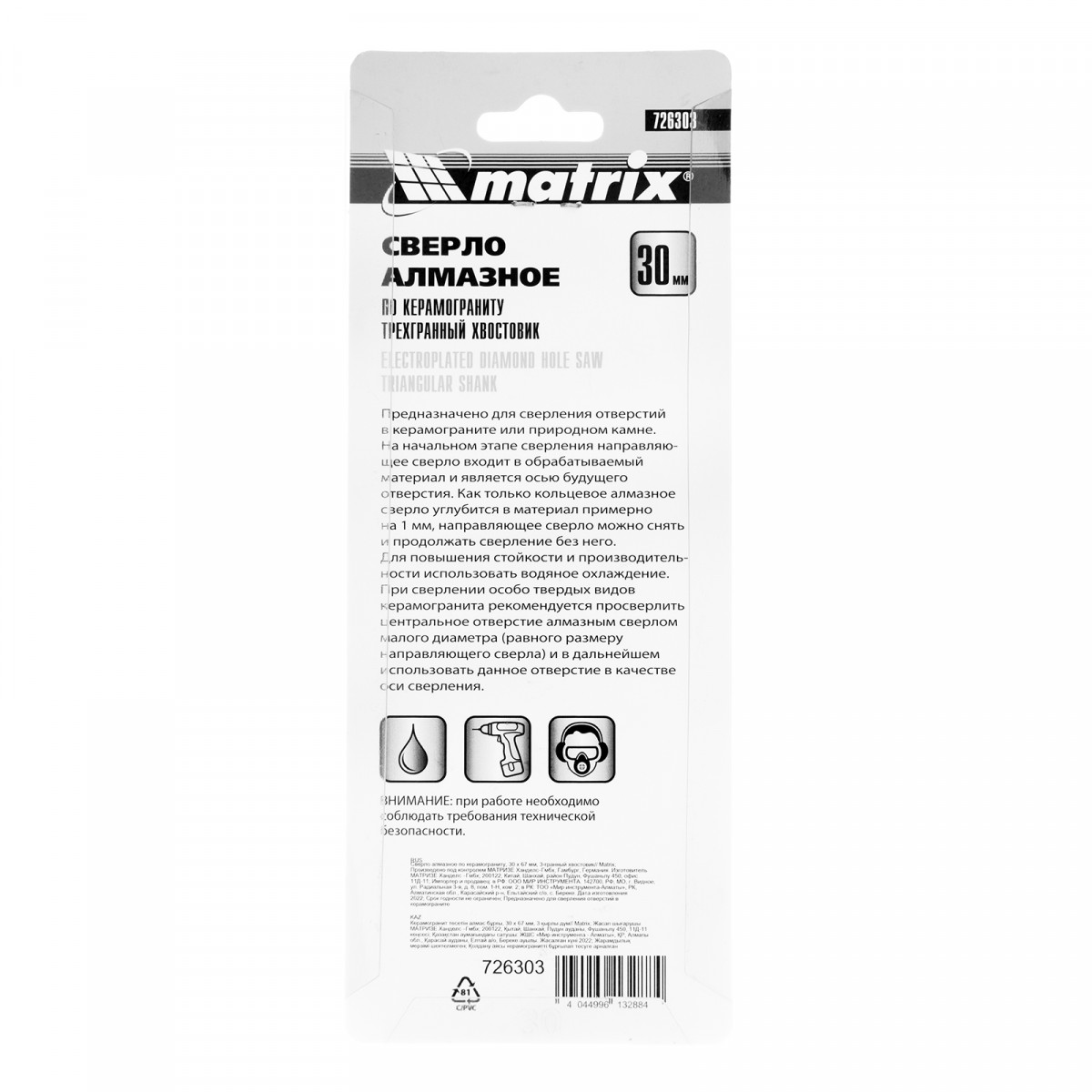 Сверло алмазное по керамограниту, 30 х 67 мм, трехгранный хвостовик Matrix
