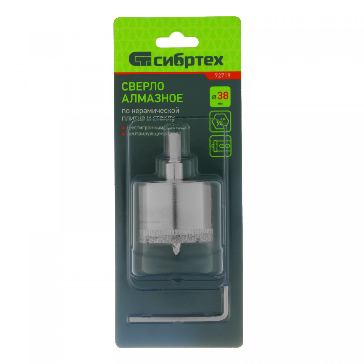 Сверло по керамической плитке и стеклу, 38 х 55 мм, шестигранный хвостовик, с центрующим сверлом Сибртех