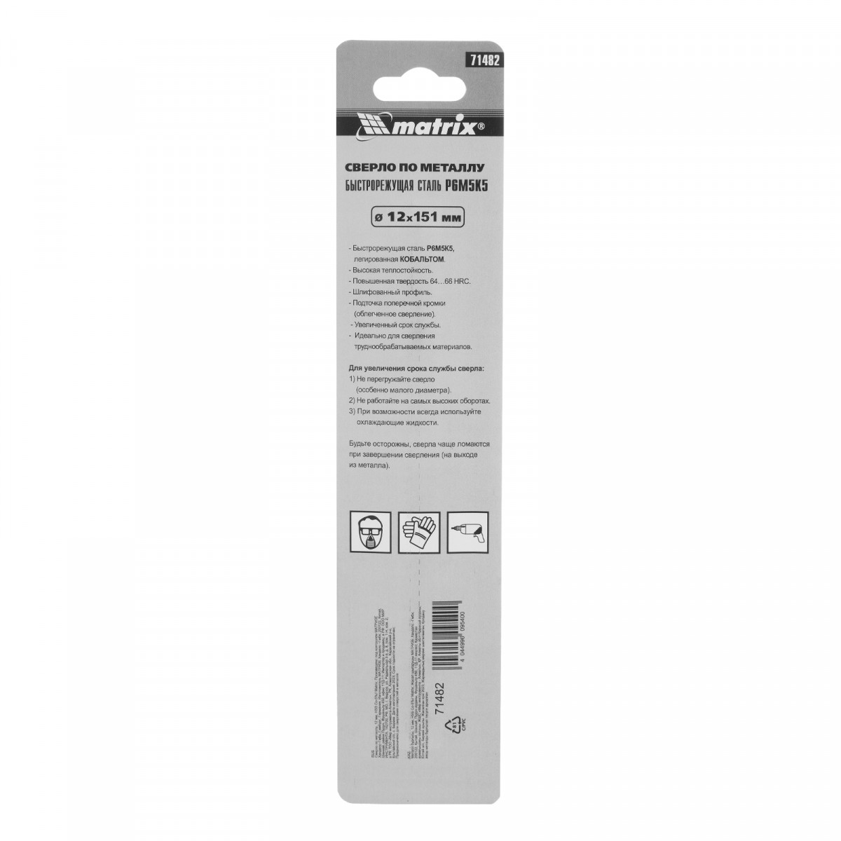 Сверло Matrix 71482 диаметром 12 мм, из стали HSS Co-5%, имеет угол заточки 135°, оптимальный для сверления легированных и цветных металлов. Подходит для профессионального использования на строительной площадке.