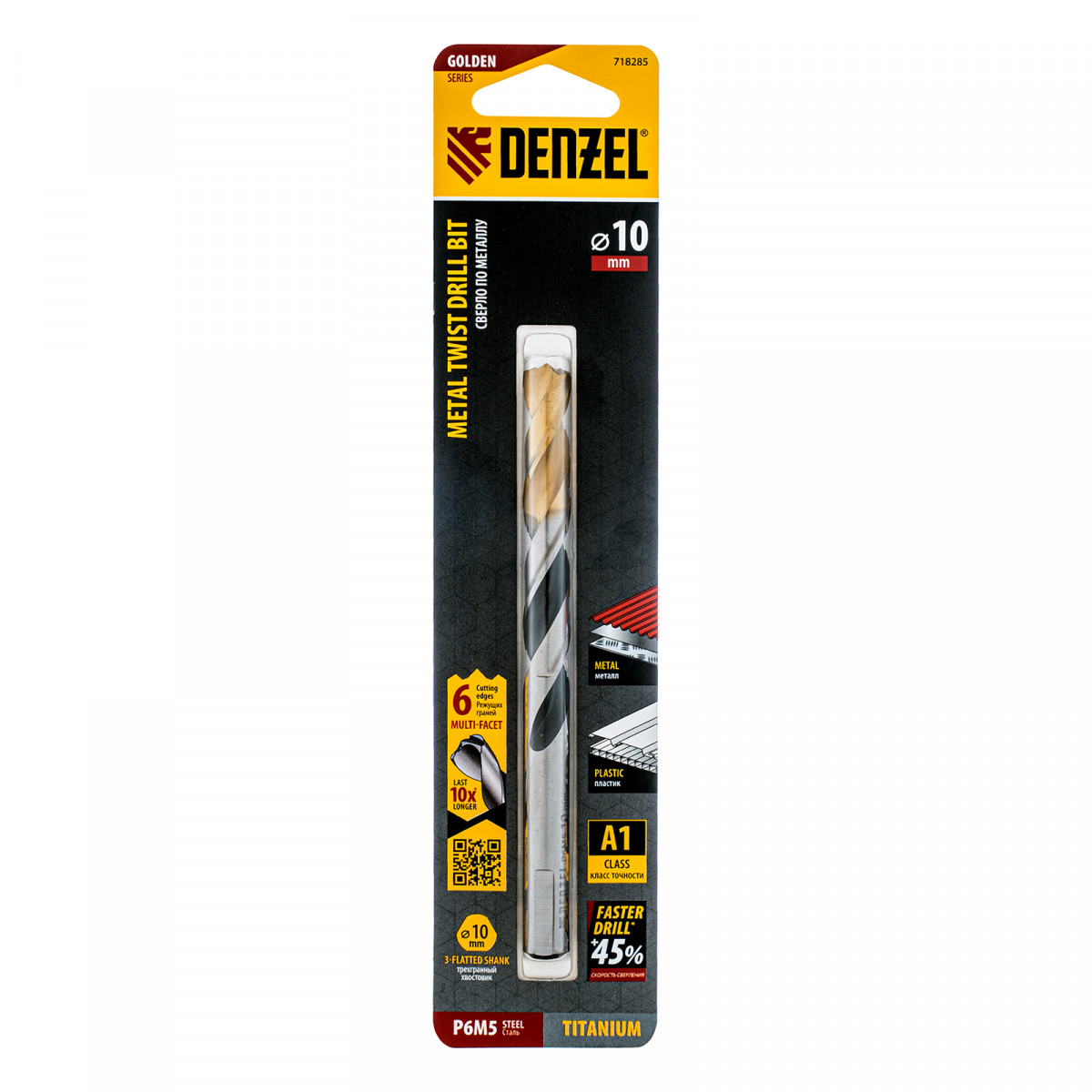 Спиральное сверло по металлу Denzel Golden Tip 718285 из стали P6M5, размером 10 х 133 мм, с многогранной заточкой, предназначено для получения отверстий в легированных сталях и цветных металлах. Многогранная заточка позволяет получать чистые и ровные отверстия практически без заусенцев. Сверлу присвоен класс точности A, что гарантирует высокое качество работ. Оснастка подходит для бытового и профессионального применения.