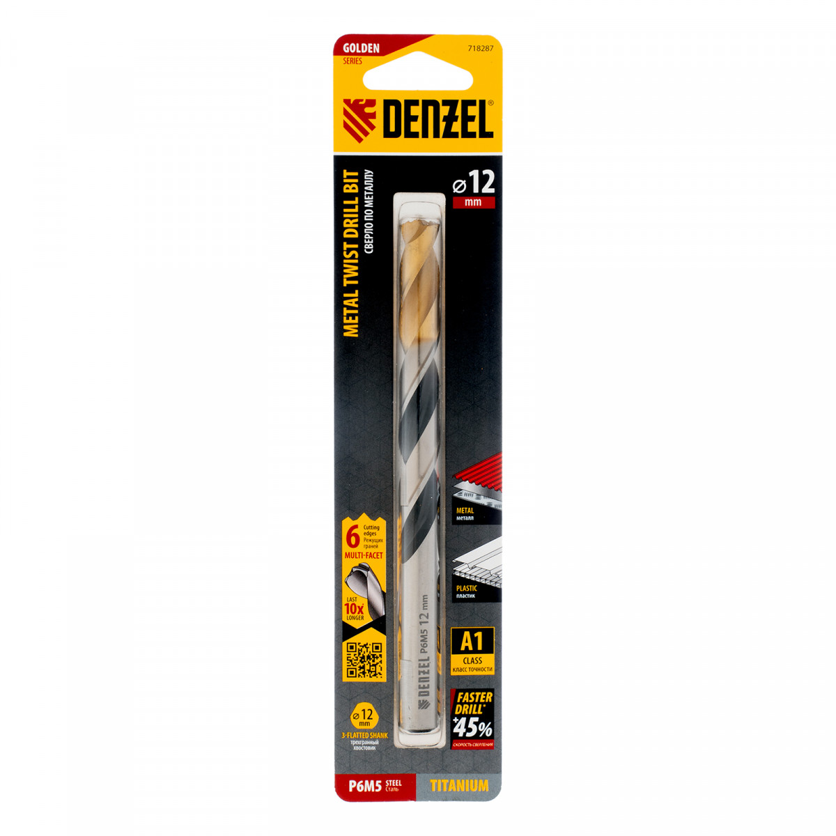 Спиральное сверло по металлу Denzel Golden Tip 718287 из стали P6M5, размером 12 х 151 мм, с многогранной заточкой, предназначено для получения отверстий в легированных сталях и цветных металлах. Многогранная заточка позволяет получать чистые и ровные отверстия практически без заусенцев. Сверлу присвоен класс точности A, что гарантирует высокое качество работ. Оснастка подходит для бытового и профессионального применения.
