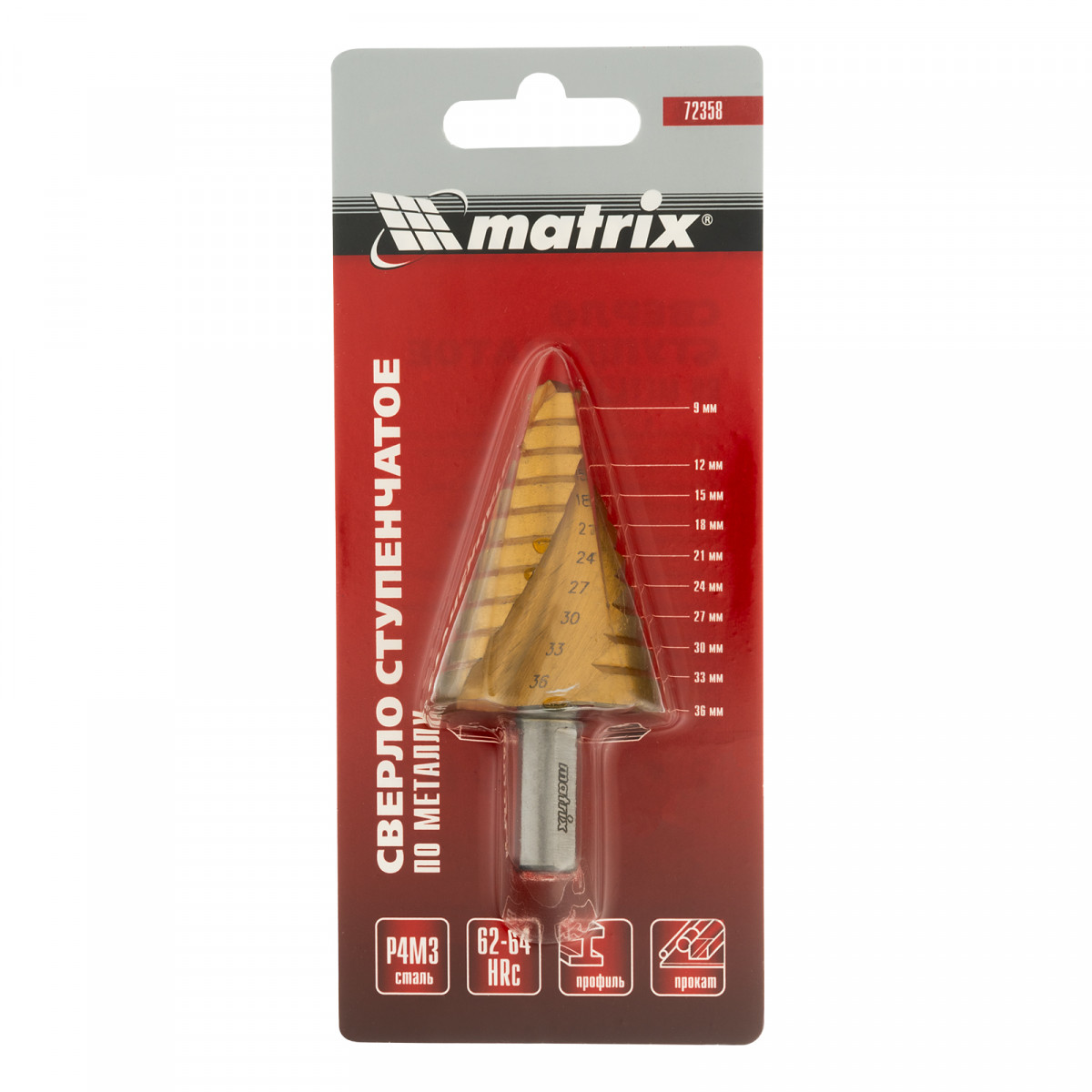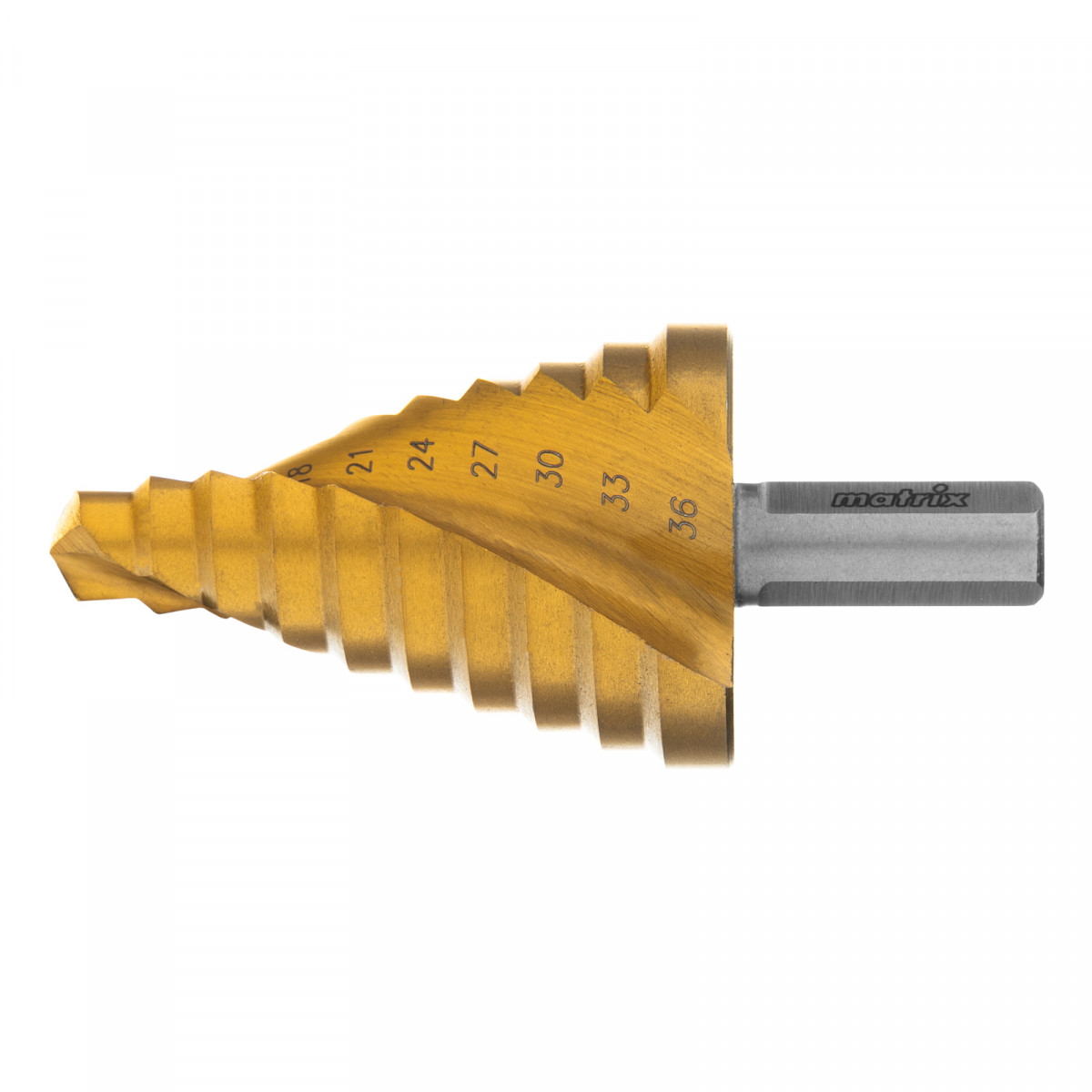 Сверло ступенчатое, 9-12-15-18-21-24-27-30-33-36 мм, HSS, спиральный профиль, трехгранный хвостовик Matrix