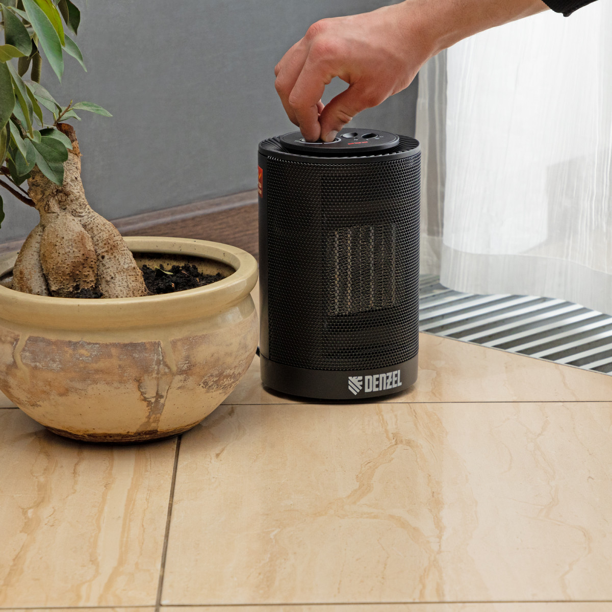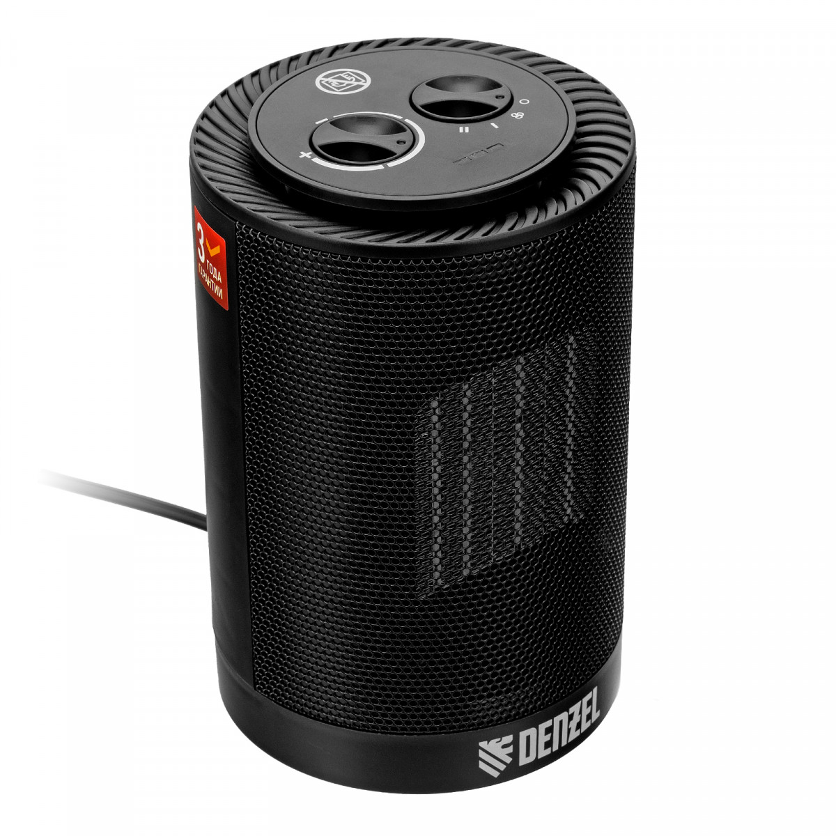 Тепловентилятор Denzel DTFC-1200S с керамическим нагревательным элементом и функцией вращения работает в 1 из 3 режимов: вентиляция, нагрев на мощности 600 Вт и нагрев на мощности 1200 Вт. Равномерно прогревает окружающее пространство благодаря функции осцилляции (вращения). Создает комфортный микроклимат, поскольку не сжигает пыль и не пересушивает воздух. Предназначен для обогрева помещений площадью до 12 м2, используется в бытовых целях.