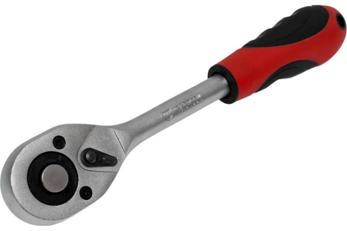 Трещотка используется при работах с торцовочными головками. Изготовлена из высокопрочной стали, обладает высокой прочностью и стойкостью к коррозии. Флажковый механизм трещотки позволяет переключать направление рабочего вращения. Устройство быстрого сброса надежно фиксирует насадку на приводе и легко от нее освобождается одним нажатием на кнопку.