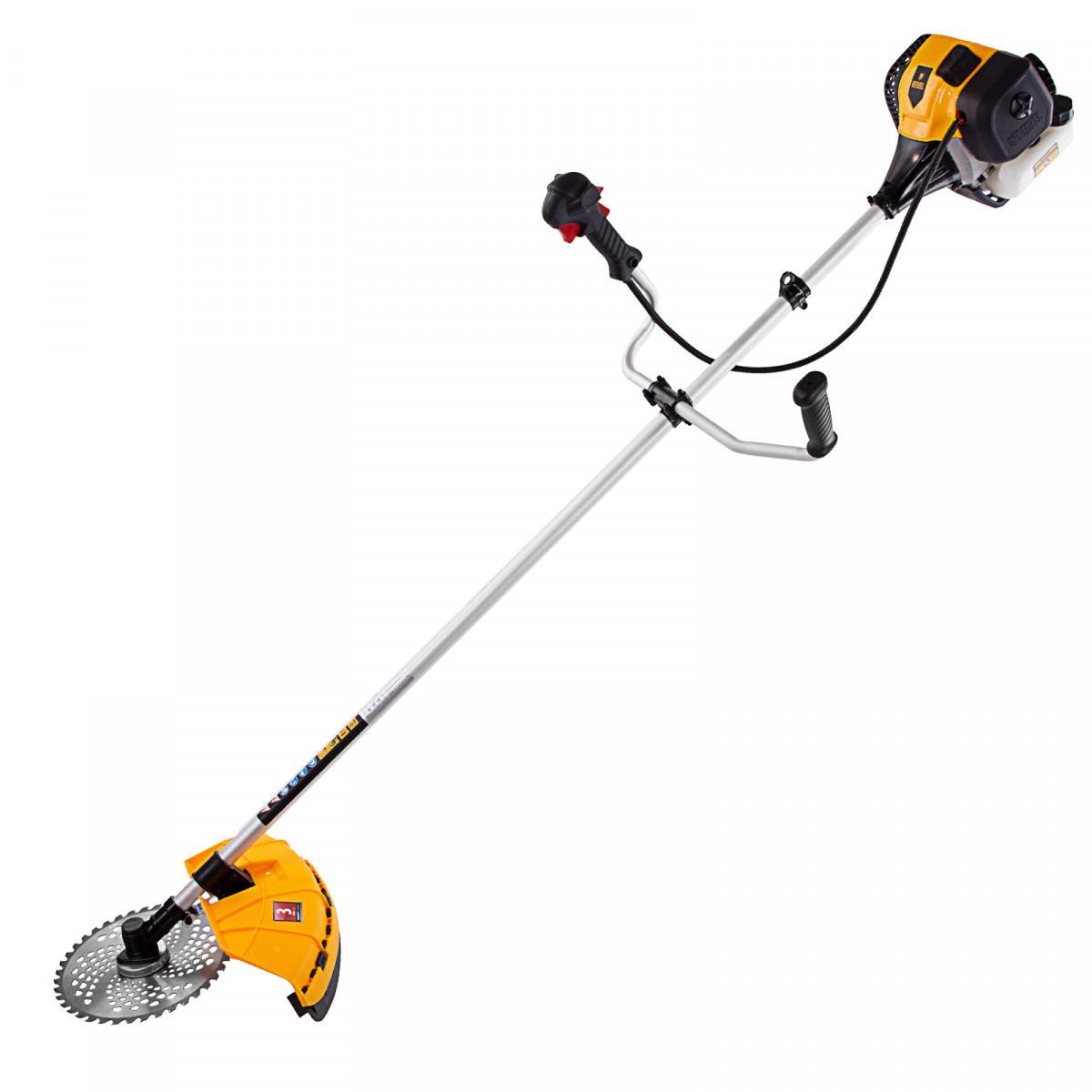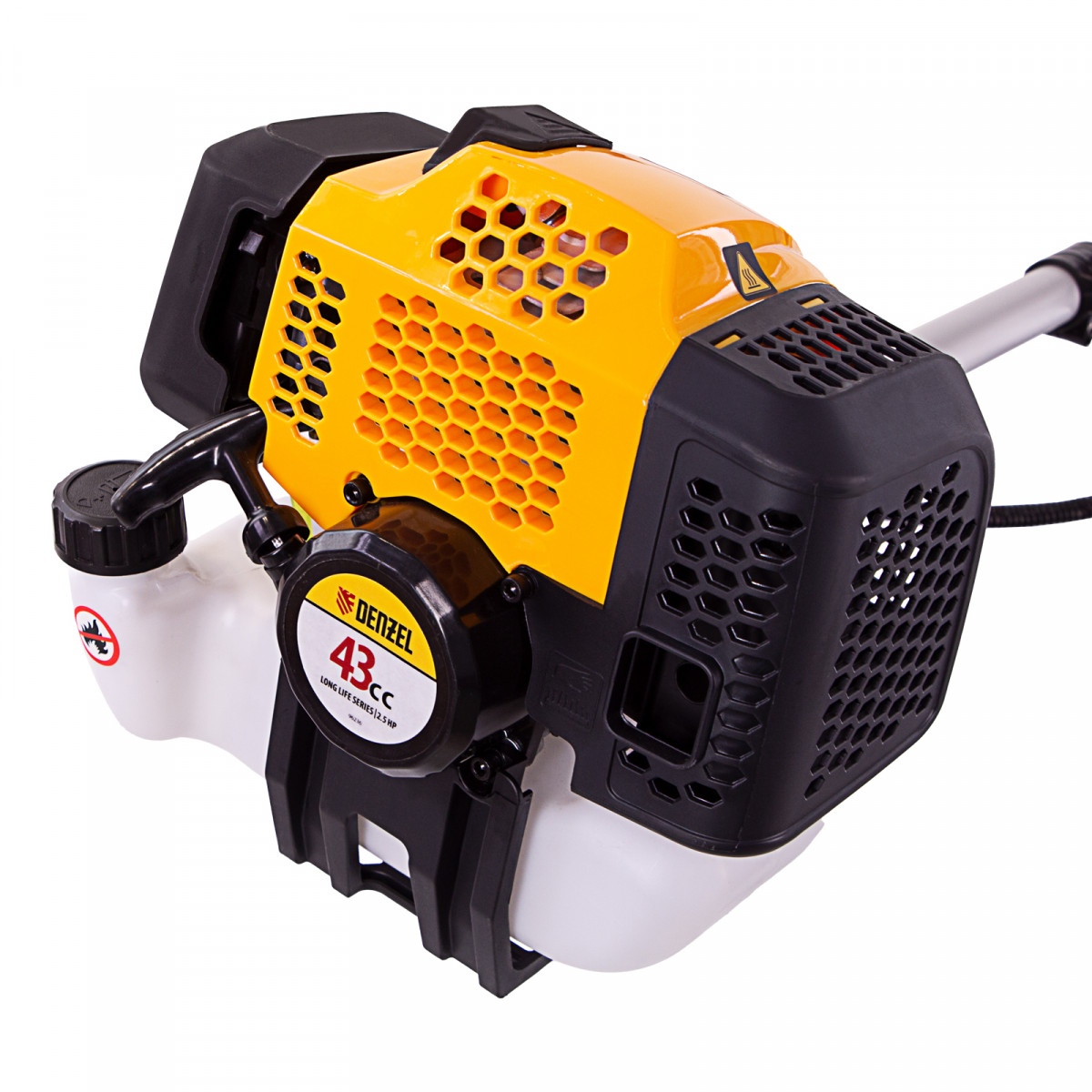 Бензиновый триммер Denzel DGT-430 96236 с двигателем объемом 43 см3 и мощностью 2,5 л.с., с неразъемной штангой, состоит из 2 частей. Предназначен для скашивания густой травой и создания аккуратных лужаек, подходит для скашивания травы всех типов, в том числе с жесткими древовидными стеблями (полыни, крапивы, лебеды, борщевика), а также срезания кустарника и молодых побегов деревьев с диаметром стволов до 10 мм. Подходит для мест, в которых с обычными газонокосилками работать тяжело. Экономичный двигатель позволяет эффективно обрабатывать участок площадью до 9-10 соток.,В комплект поставки входят режущие насадки: усиленная полиамидная катушка, трехлопастный нож и пильный диск.