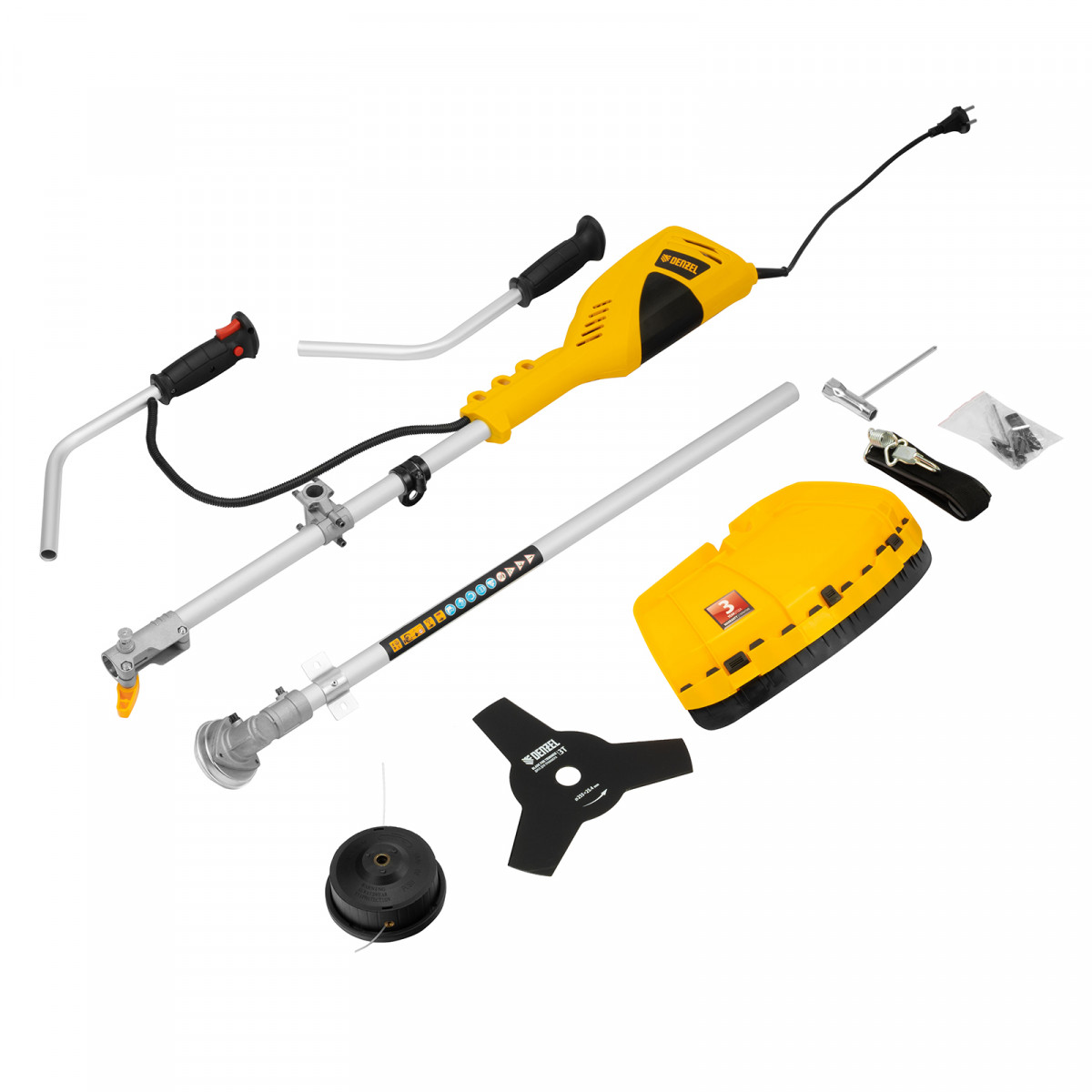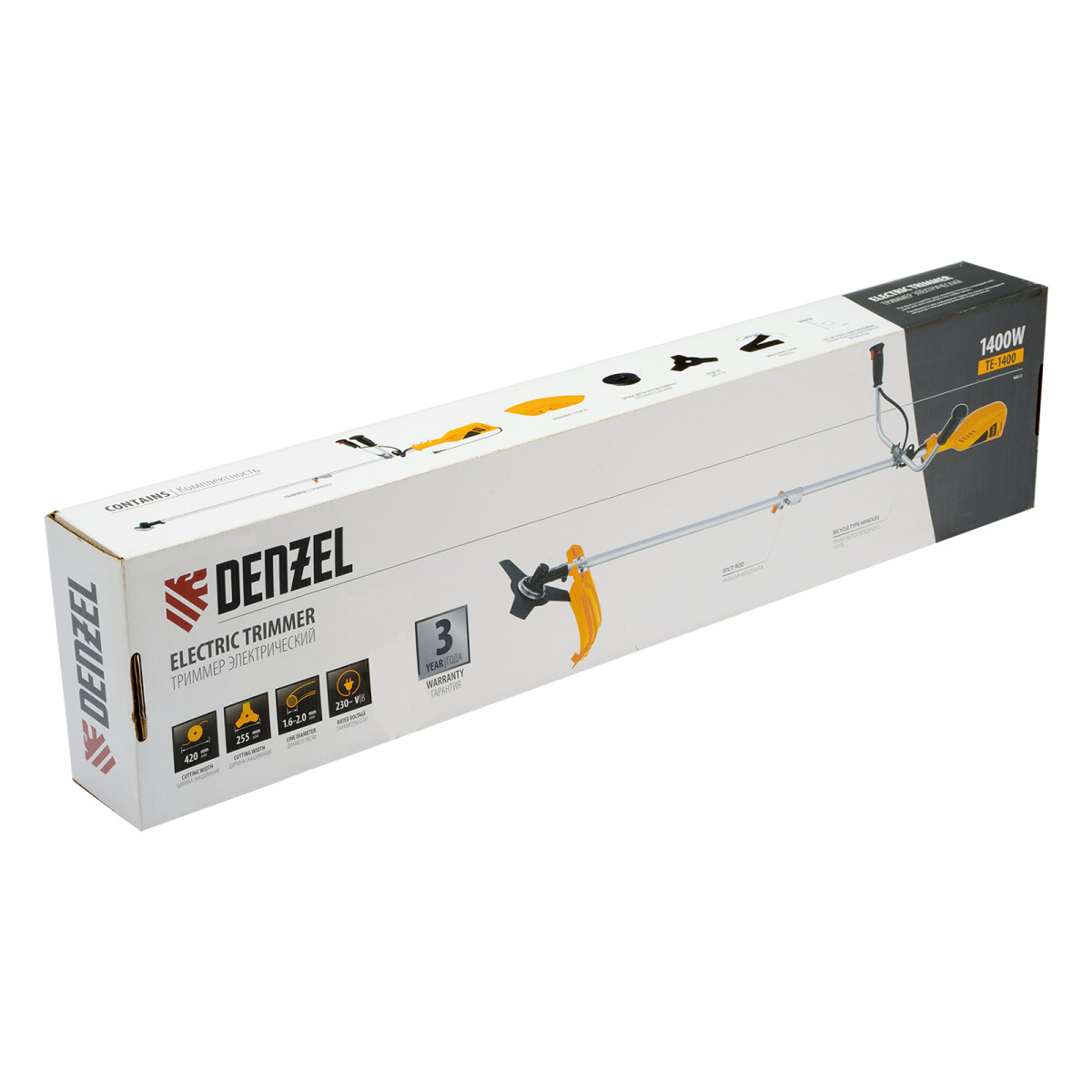 Триммер Denzel TE-1400 96612 мощностью 1400 Вт, с разборной штангой, комплектуется катушкой с леской и 3-лопастным диском, ширина скашивания составляет 420 мм и 255 мм соответственно. Идеален для скашивания травы различных типов, в том числе с жесткими стеблями (полыни, крапивы, лебеды). Благодаря верхнему расположению двигателя может косить мокрую траву. Двигатель мощностью 1400 Вт обеспечивает вращение оснастки с частотой 7500 об/мин, поэтому уход за участком не займет много времени. Электротриммер прост в обращении — ему не требуется сложное техническое обслуживание, пользоваться им сможет даже новичок. ,К триммеру можно приобрести диск Denzel 96323 с шириной скашивания 230 мм для быстрого удаления растительности с жесткими стеблями, 96328 для скашивания молодых побегов кустарника диаметром до 3 мм, 96340 для срезания борщевика, кустарника и молодых побегов деревьев с диаметром стволов до 10 мм.