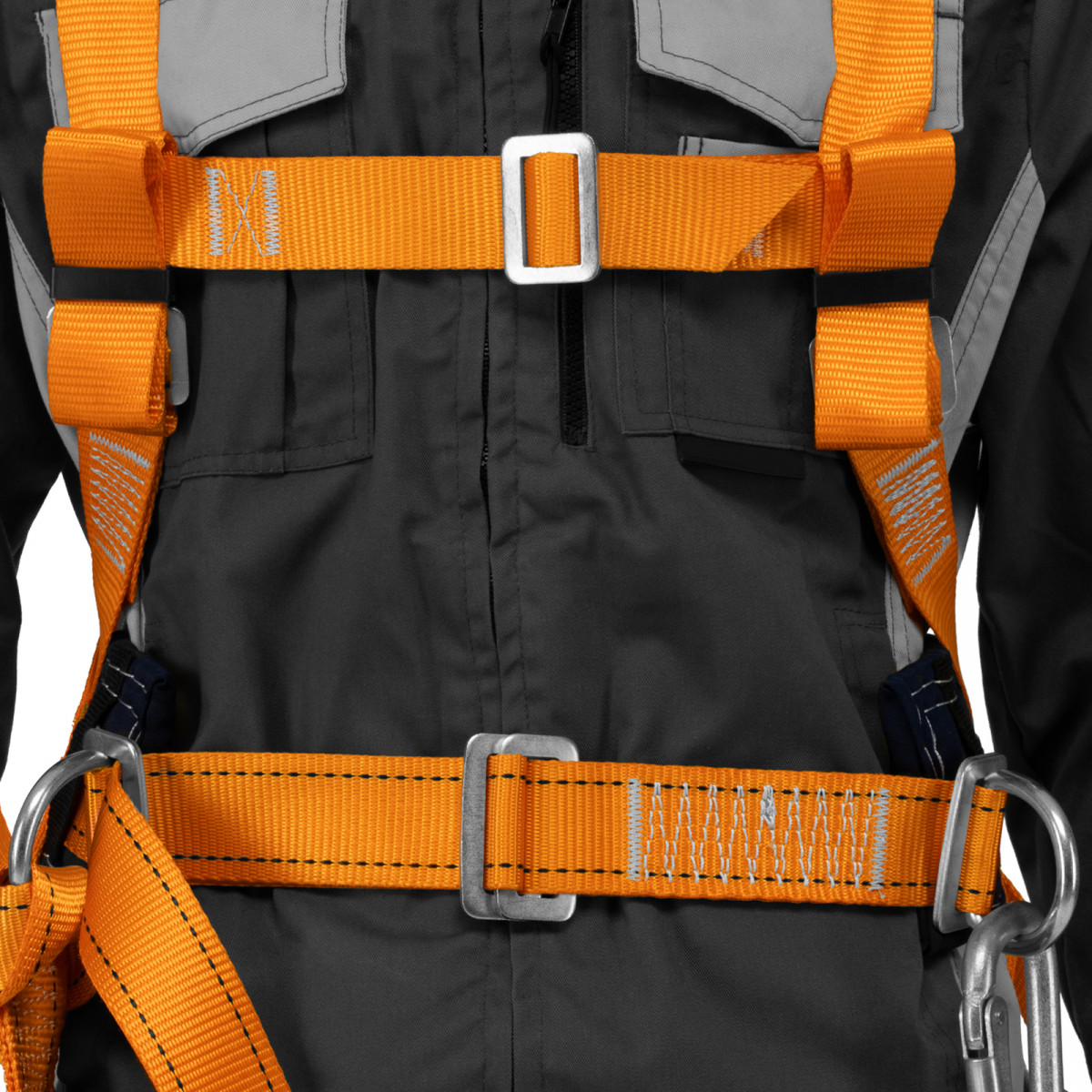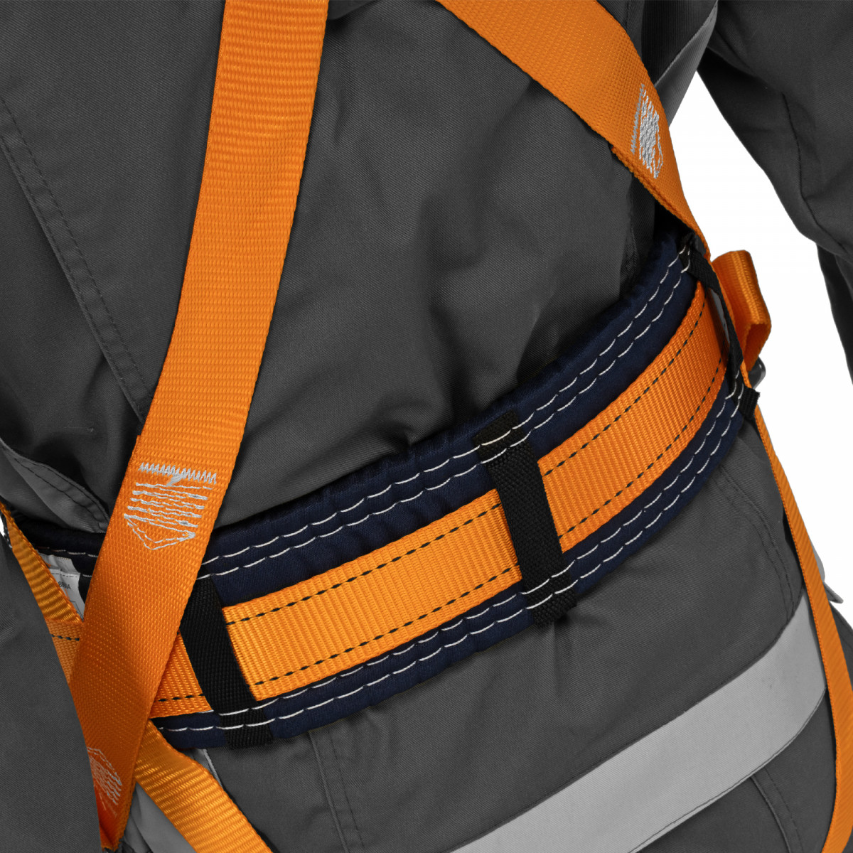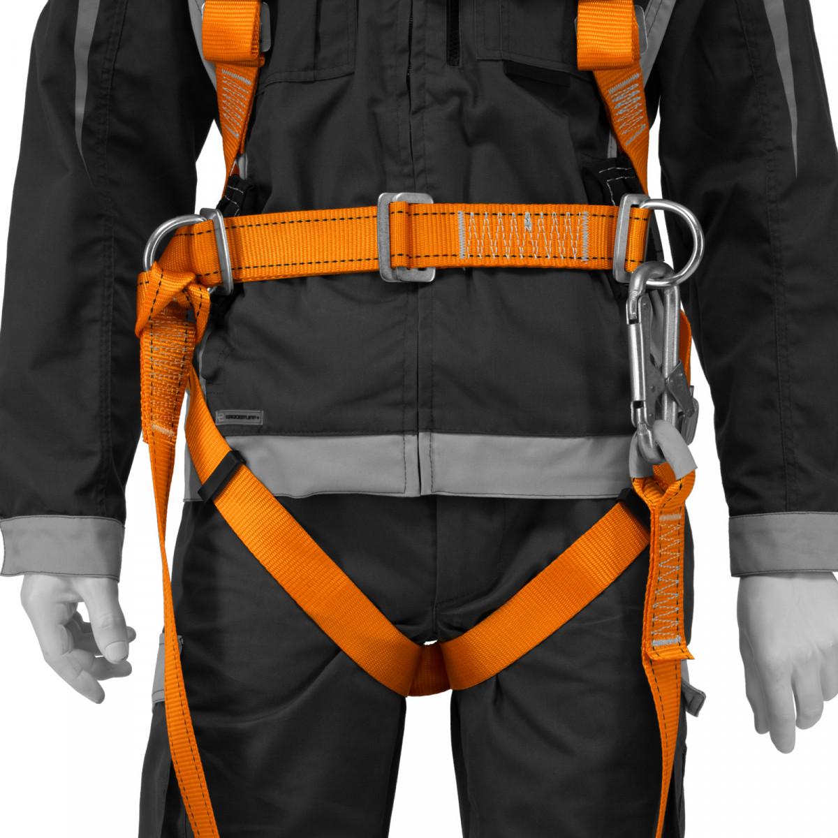 • Надежное крепление — привязь имеет 2 прочных D-кольца на поясном ремне и одно на спине, а также большой монтажный карабин.
