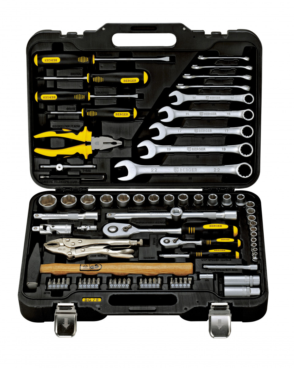 Универсальный набор инструментов 78 предметов Berger BG BG078-1214 поможет выполнить множество ремонтных и монтажных работ. Все изделия изготовлены из высокопрочной хромованадиевой стали. Инструменты проходят двойной контроль коррозионной устойчивости. Для удобной работы некоторые предметы оснащены эргономичными рукоятками, которые не скользят и удобно фиксируются в руке, что создает комфорт в работе. Набор поставляется в кейсе, для удобного хранения и транспортировки.