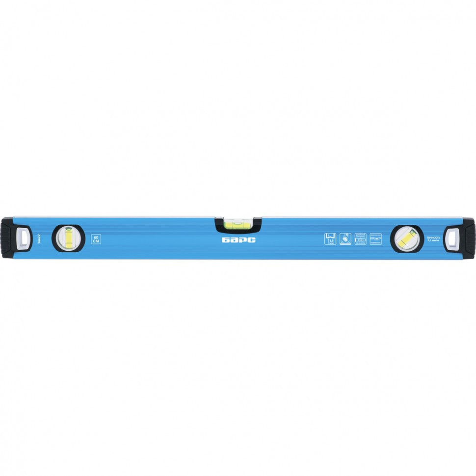 Алюминиевый уровень Барс 34426 длиной 1000 мм оснащен 3 глазками, которые позволяют проверить вертикальные, горизонтальные поверхности и соответствие наклонных поверхностей углу 45 градусов. Инструмент повышает точность строительных и ремонтных работ.Для определения отклонения вертикали 90 градусов необходимо использовать пузырьковую ампулу только в верхнем положении уровня. Только базовая поверхность является рабочей (противоположная ампуле 180 градусов).ПреимуществаИнструмент изготовлен из легкого и прочного алюминиевого профиля (марка 6063).Высокая точность работы достигается за счет фрезерованной рабочей части и двойного контроля при установке ампул.V-образная форма подошвы обеспечивает возможность фиксации инструмента на трубах при проведении сантехнических работ.Уровень выдерживает падения с небольшой высоты за счет заглушек из износостойкой термопластичной резины (TPR).Строительный уровень удобно хранить на крючке, т.к. в боковых частях имеются отверстия.
