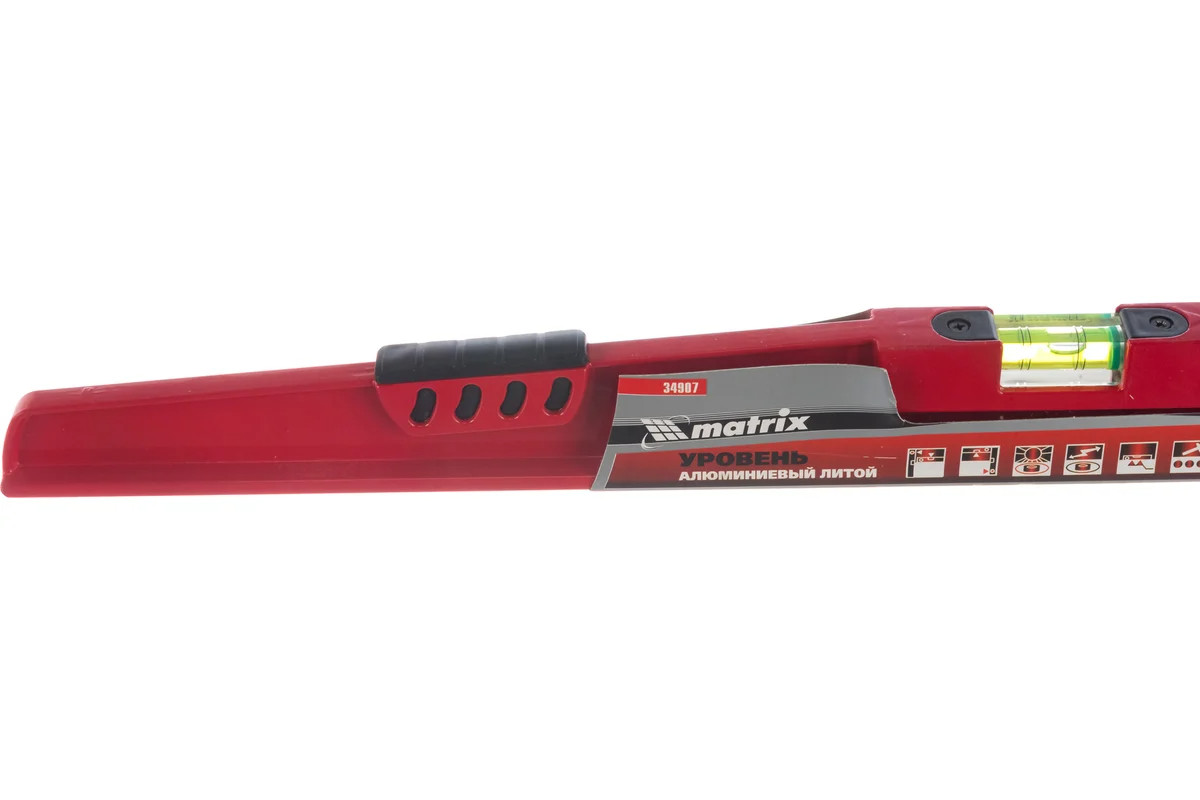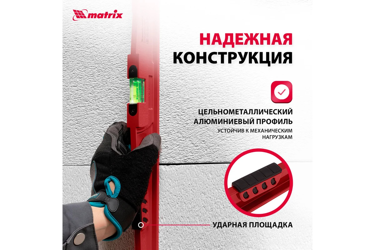 Алюминиевый уровень 600 мм, литой, 2 глазка , ударная площадка MATRIX 34907 обладает высокой прочностью. Наличие ударной площадки для выравнивания кирпича или блоков при укладке существенно упрощает работу кладочника. Для точности измерений имеются насечки возле каждого глазка и отражатели.