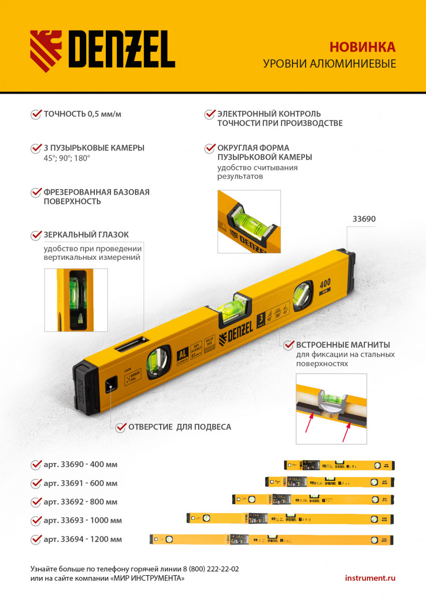 Уровень алюминиевый, магнит, фрезерованный, 3 глазка (1 зеркал.) 0,5 мм/м, 800 мм Denzel