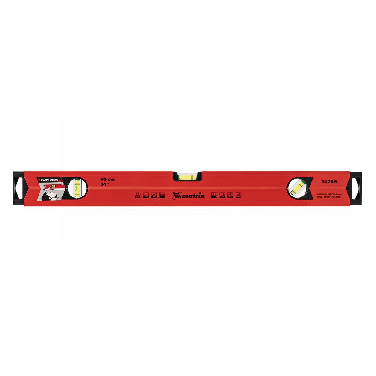 Алюминиевый магнитный уровень Matrix 34706 длиной 600 мм, усиленный, оснащен 3 глазками и одним зеркальным отражателем. С его помощью можно выявить отклонения от вертикали, горизонтали и угла 45 градусов. Встроенный зеркальный глазок повышает удобство работы, позволяя легко считывать показания.,Для определения отклонения вертикали 90 градусов необходимо использовать пузырьковую ампулу только в верхнем положении уровня. Только базовая поверхность является рабочей (противоположная ампуле 180 градусов).
