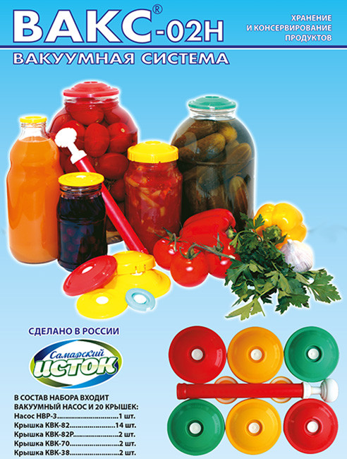 Набор вакуумный ВАКС-02Н - это вакуумная система хранения и консервирования продуктов. В состав набора входит вакуумный насос и 20 крышек.