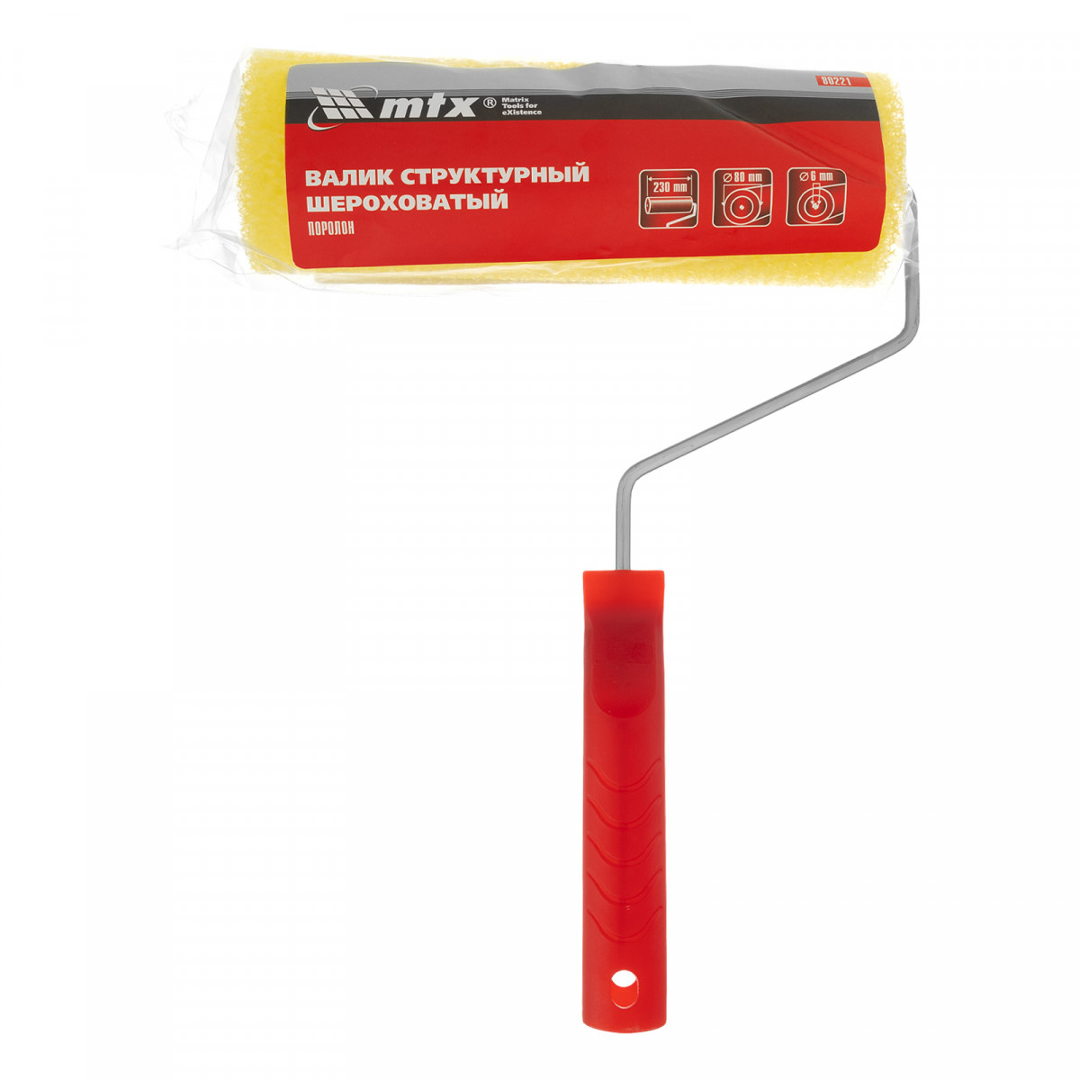 Структурный поролоновый валик MTX 80221 «шероховатый» 230 мм с ручкой диаметром 6 мм, диаметром ролика 80 мм, предназначен для декоративной отделки стен, потолков, фасадов и других поверхностей. Он подходит для нанесения водно-дисперсионных фактурных красок, декоративной штукатурки, жидких материалов без содержания химических растворителей и щелочи. Небольшие отверстия в поролоновой шубке позволяют создать оригинальный узор на поверхности. Валик прост в применении и не требует владения профессиональными навыками.