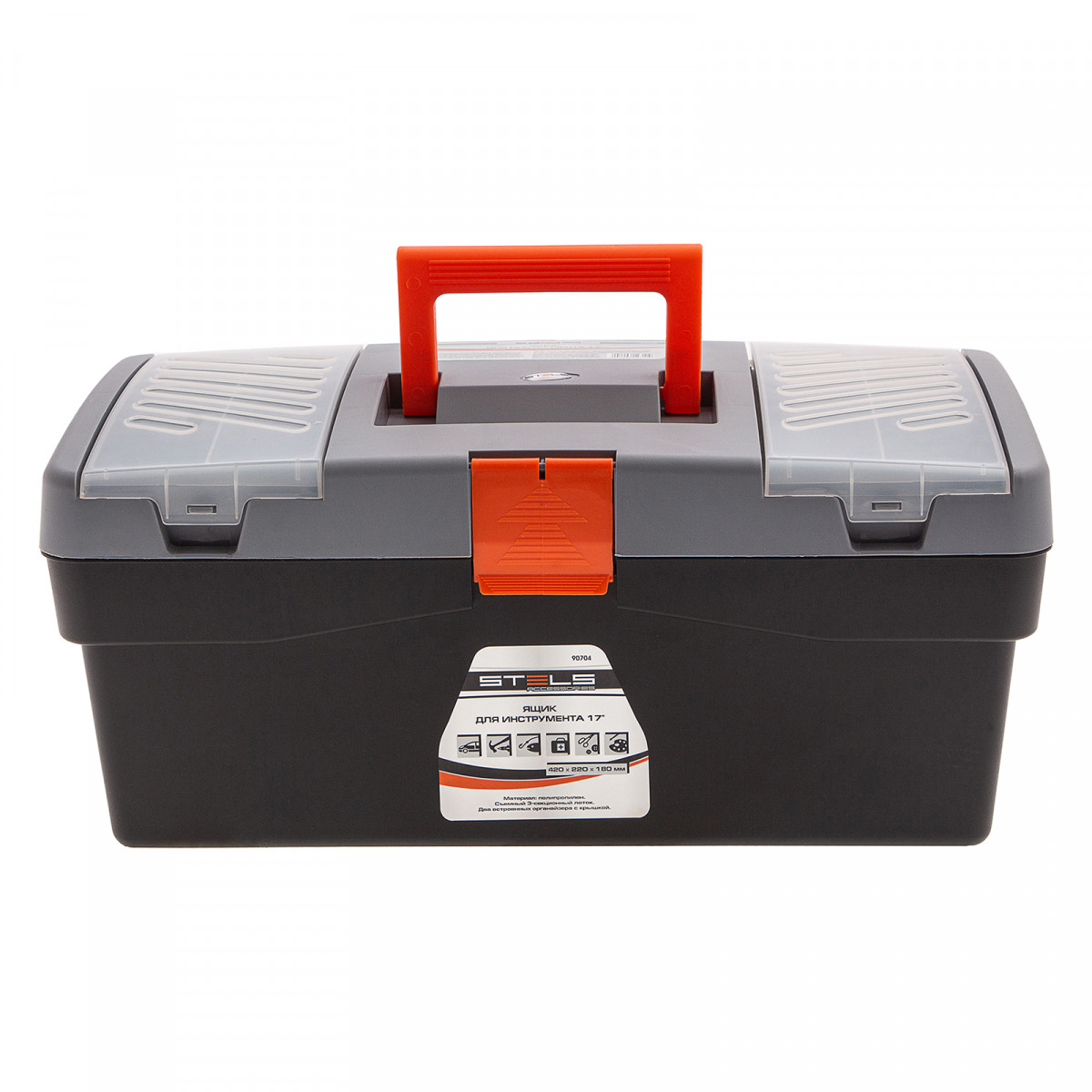 Ящик для инструмента Stels 90704 из пластика, длиной 17", габаритами 420 х 220 х 180 мм, предназначен для переноски и хранения инструментов, хозяйственных мелочей, рыболовных снастей. Крышка надежно закрывается, поэтому содержимое не рассыплется. Встроенные в крышку отделения обеспечивают быстрый доступ к крепежам и другим необходимым предметам. Большой ящик для хранения инструментов будет полезен дома, на даче, в гараже и на рыбалке.