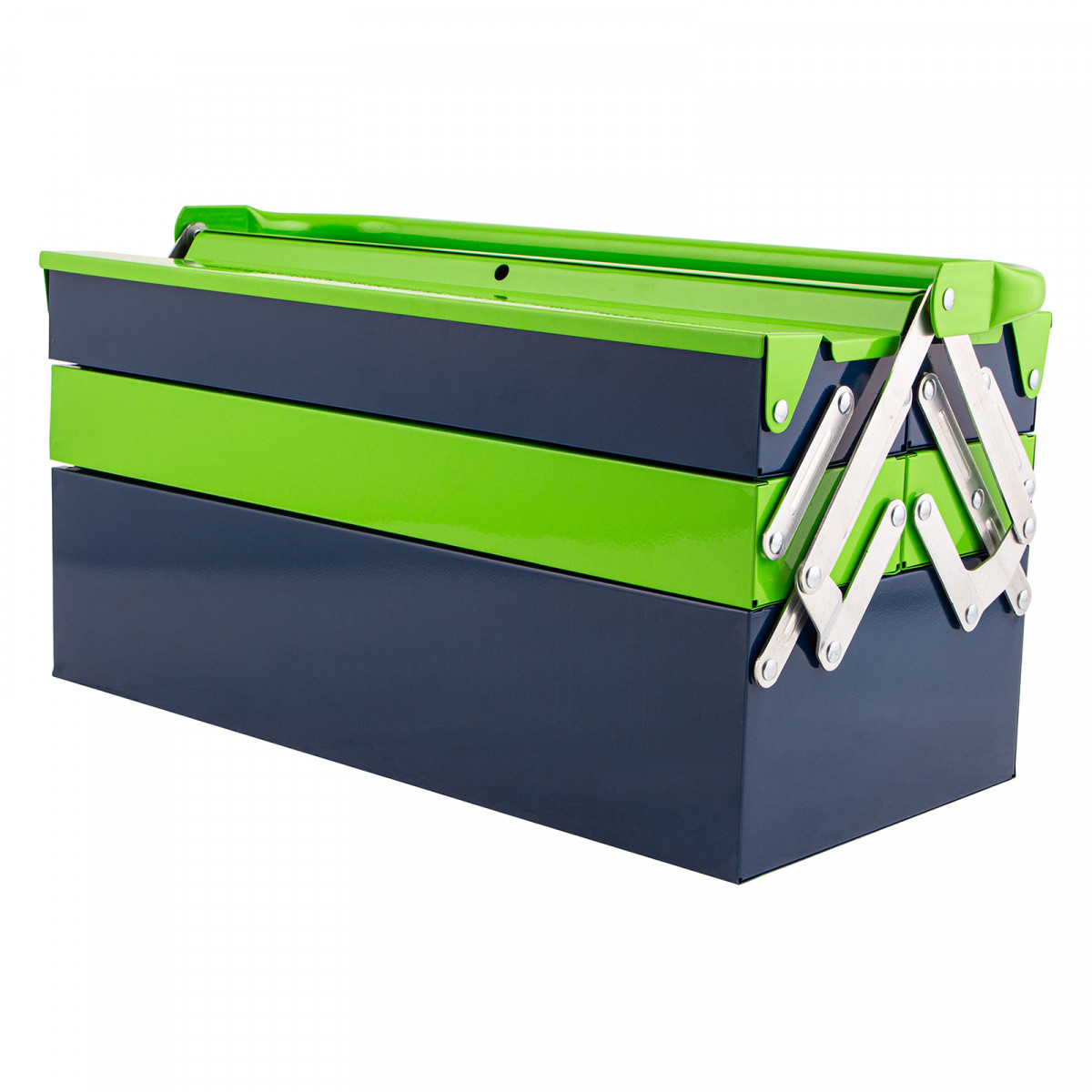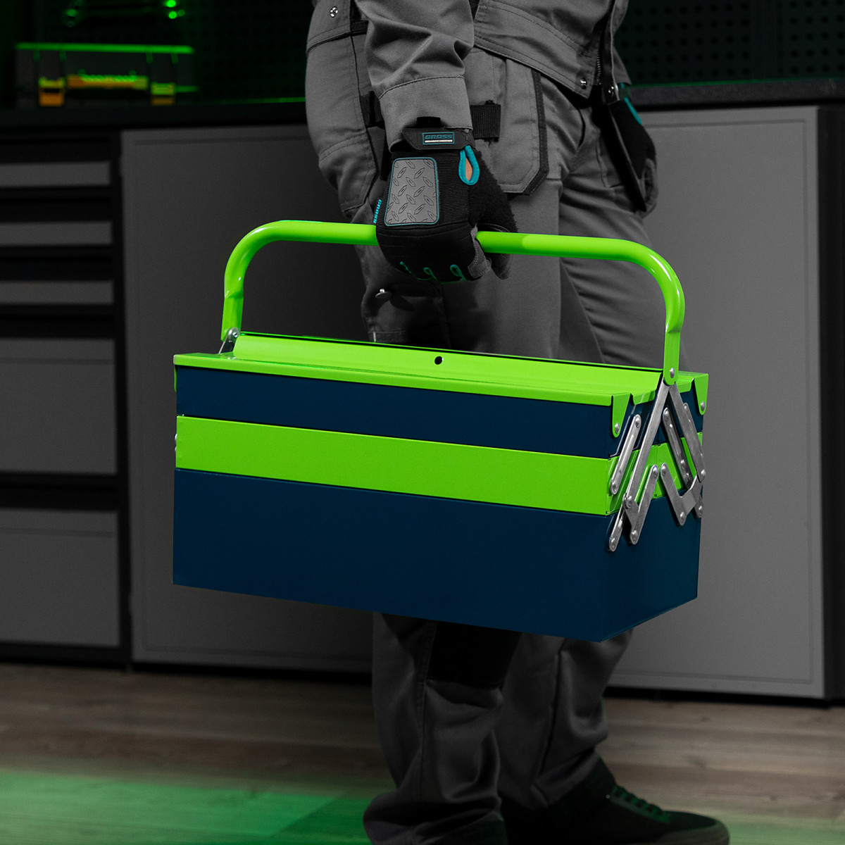 - Удобное использование — ящик легко раскладывается, ручка поворачивается и не мешает размещать или извлекать инструменты.