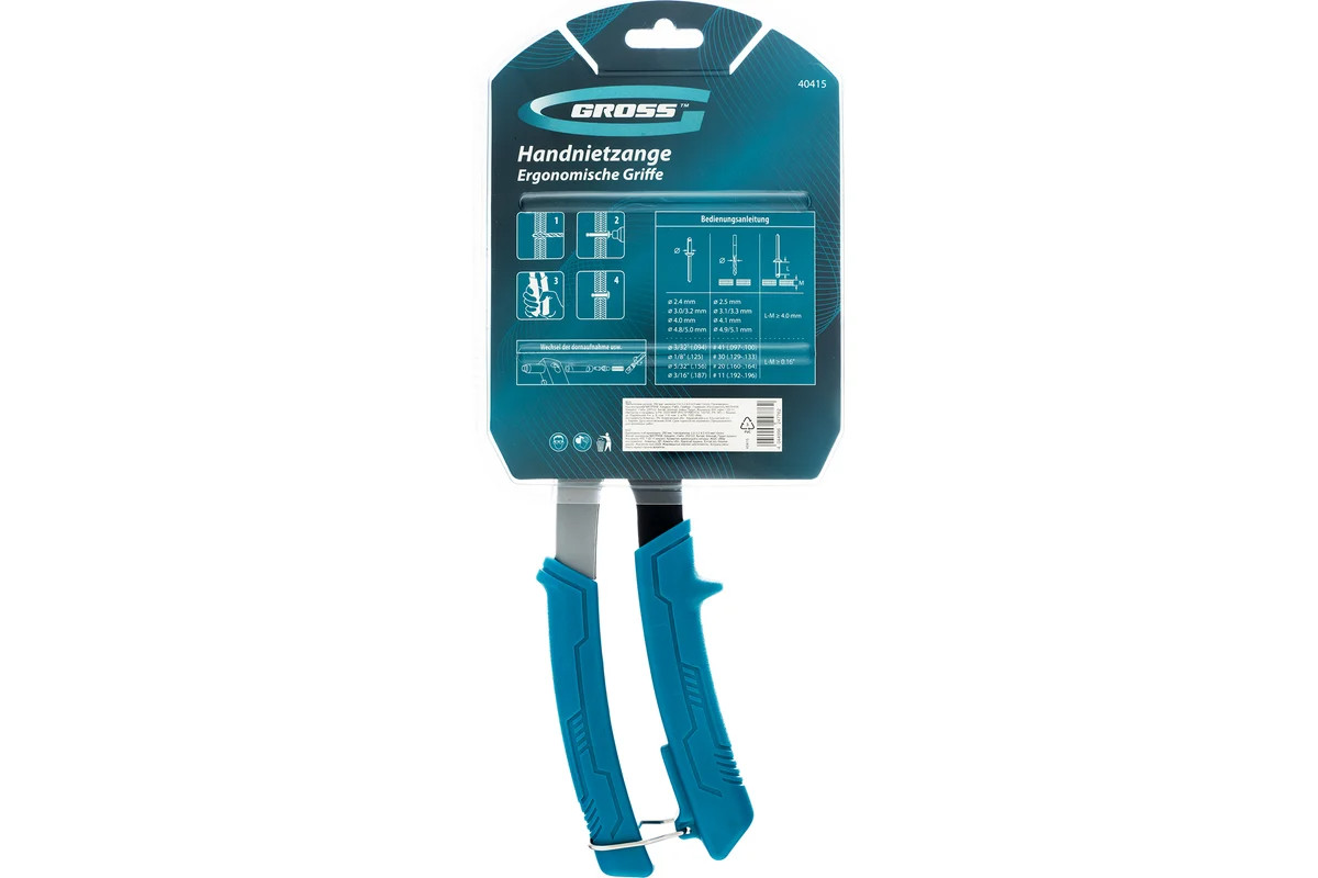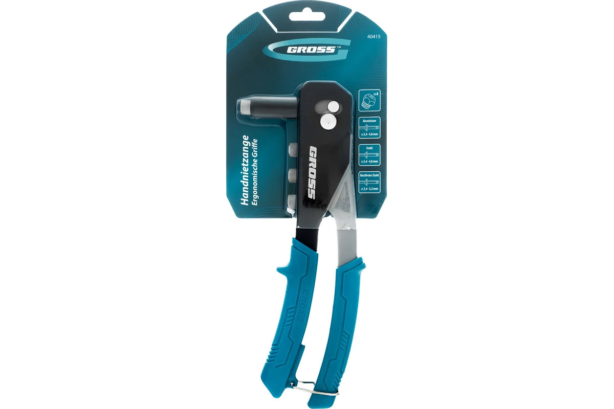 Заклепочник Gross 40415 длиной 260 мм используется для соединения плоских заготовок, металлических профилей и тонкостенных конструкций при помощи вытяжных заклепок из стали типоразмера 2,4-4,0 мм, алюминия (2,4-4,8 мм) и «нержавейки» (2,4-3,2 мм). Обеспечивает быстрое и надежное крепление. Соответствующие сменные головки входят в комплект поставки. Инструмент будет полезен на строительной площадке, в ремонтной мастерской, а также в быту.