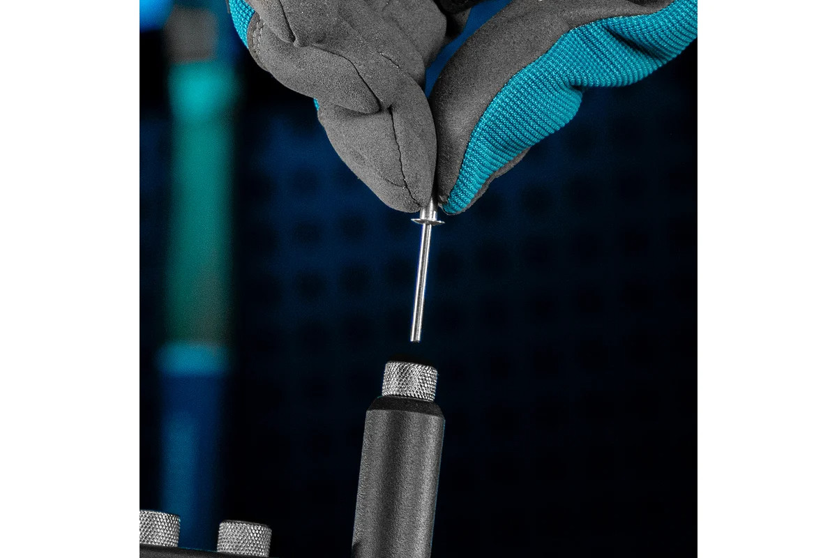 • Продуманная конструкция — сменные насадки устанавливаются в корпус заклепочника, поэтому они не потеряются.