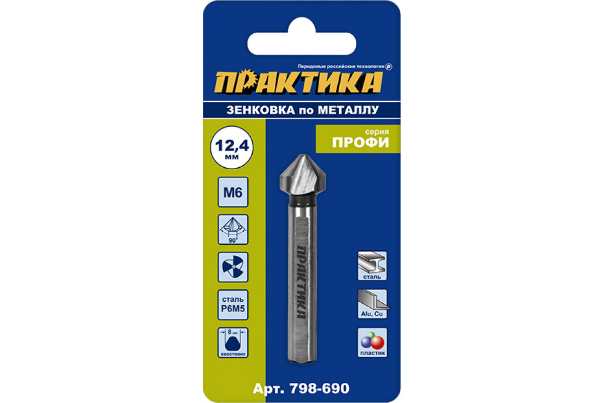 Зенковка по металлу 12.4x56 мм, 90 град., под резьбу М6 ПРАКТИКА 798-690 предназначена для снятия фаски по краю отверстия или формирования конического углубления под потайные головки крепежных элементов в стали с пределом прочности до 900 Н/мм2, сером чугуне, цветных металлах и твердом пластике. Изготовлена из быстрорежущей стали Р6М5 с поверхностным упрочнением режущей кромки.