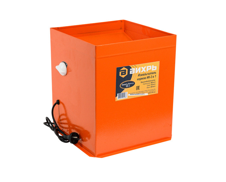Есть возможность регулирования размера фракций измельчаемых продуктов.Два сменных ножа: первый – универсальный круглый – для травы, сена и корнеплодов, второй – для зерна. Ножи входят в комплектацию.Модель ИК ВИХРЬ 3 в 1 оснащена однофазным коллекторным электродвигателем мощностью 1350 Вт,
